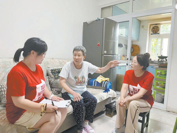 7月15日,记者来到月季园二区,正赶上陈雪艳和乔焕到独居老人家中巡查探访。陈雪艳说,该小区共有76户独居老人,她和乔焕是养老驿站的巡查员,每天的工作之一就是探访、记录、反映老人的需求。她们正要去的是75岁的王女士家。