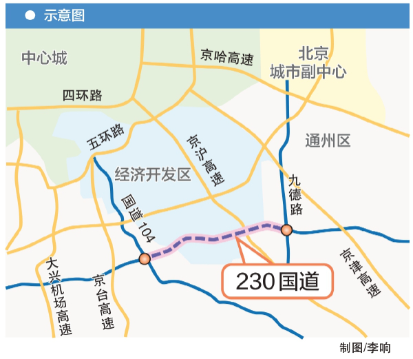 在此之前,九德路与104国道之间并没有直接相连的道路。230国道青云店段、长子营段、马驹桥段是市级重点工程,也是“城南行动计划”的一部分,该工程涉及大兴、通州两个区,其中大兴约11千米、通州约4千米。道路双向6车道,全线设置桥梁9座,途经青云店镇、长子营镇、马驹桥镇多个村庄,沿线分布着小米汽车、奔驰汽车等多家知名企业。
