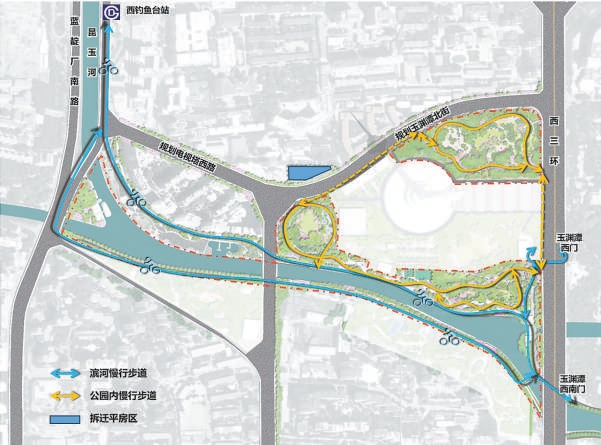 按照最新出炉的方案,电视塔西路、玉渊潭北街建成并贯通后,永定河引水渠北侧巡河路(西三环至蓝靛厂南路段)将调整为慢行道路,现状跨河人行桥也同步改造。这将彻底根治目前这段路人车混行的问题,实现区域内总长约2.8公里滨水步道骑行联通。