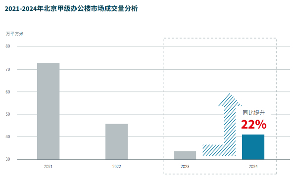 仲量联行发布的《2024北京商业地产市场回顾及总结》显示,2024年,全市甲级办公楼市场流动性有所好转,成交量较2023年明显回升。随着新旧动能加速转换,在传统生产力向新质生产力转型的关键阶段,作为重要产业载体的办公楼市场也正面临需求端的新机遇。