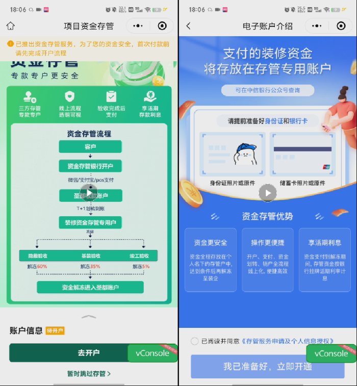 贝壳整装给出的解决方案是:引入银行作为独立第三方,建立“节点验收、双向确认、银行拨付”的闭环机制。消费者的装修款项直接存入中信银行专用存管账户,不进入企业经营体系,产生利息归消费者所有。工程被拆分为水电验收、基装验收、竣工验收等关键节点,按60%、35%、5%的比例分批次解冻,每个节点经业主确认满意后,银行才将对应款项划转至装修企业。