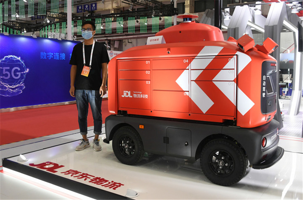 在2021世界5G大会展览现场拍摄的智能快递车(8月31日摄)。新华社记者 任超 摄