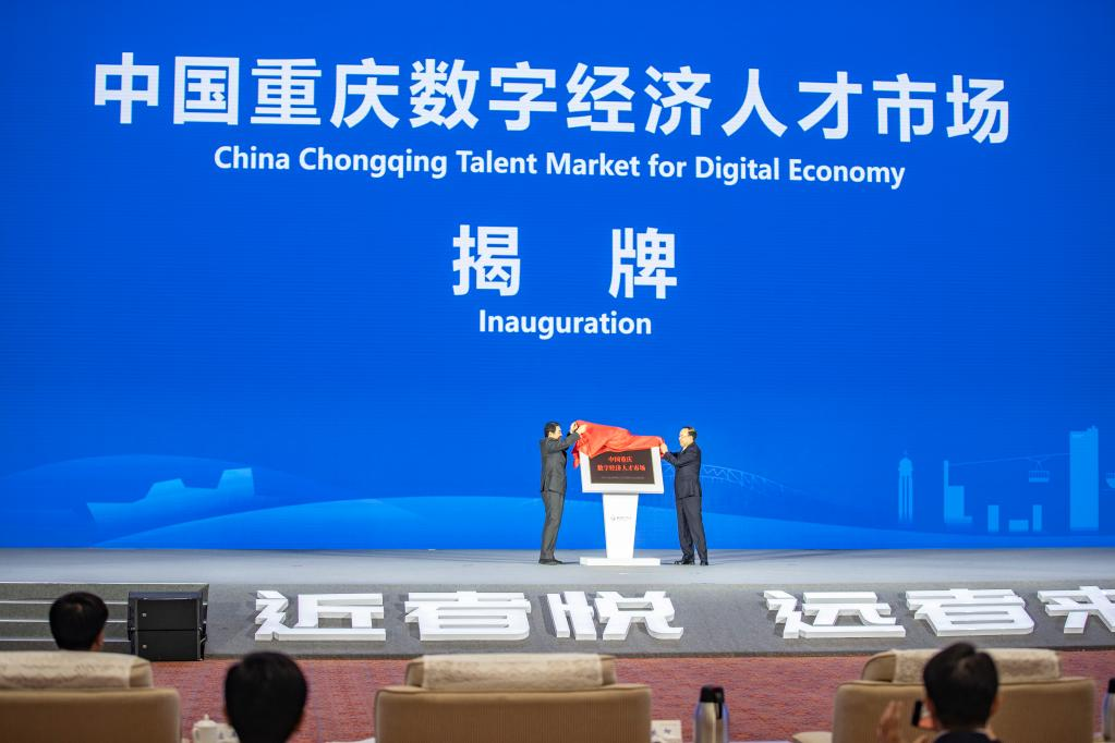 11月20日,嘉宾为中国重庆数字经济人才市场揭牌。 当日,在重庆开幕的2021重庆英才大会上,中国重庆数字经济人才市场正式揭牌成立。这是经人社部批复设立的我国首家数字经济人才市场,旨在助力重庆加快集聚数字经济人才,优化数字经济人才流动和配置,打破数字经济产业创新发展瓶颈。到2025年,该市场将力争打造成高端数字经济人才培育基地、全国数字经济人才输送交流平台。 新华社记者 黄伟 摄