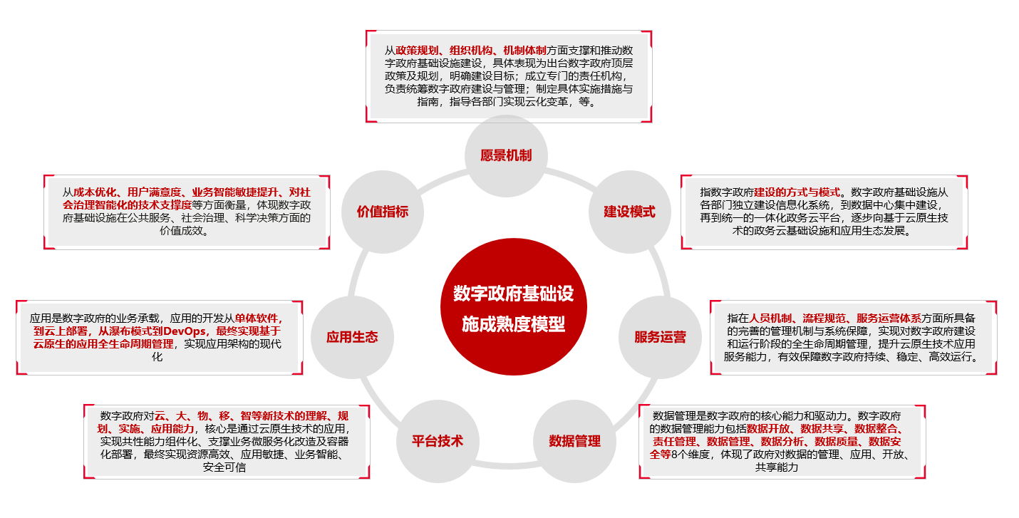 信通院与华为云在会上共同发布了“数字政府基础设施成熟度模型”(以下简称“模型”),模型由华为云与信通院在参考国内、外关于数字政府和数字化转型评价研究成果的基础上联合开发,为各地数字政府建设的业主单位提供了一套全新的评价基准。模型从愿景机制、建设模式、服务运营、数据管理、平台技术、应用生态、价值指标七个视角,结合机制建设与技术发展,全面衡量数字政府基础设施规划、建设、应用的成熟度水平。体现了数字政府基础设施发展的趋势。