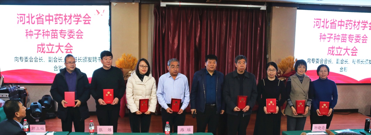 图为河北省中药材学会理事长谢晓亮为种子种苗专委会会长、秘书长、副会长颁发聘书