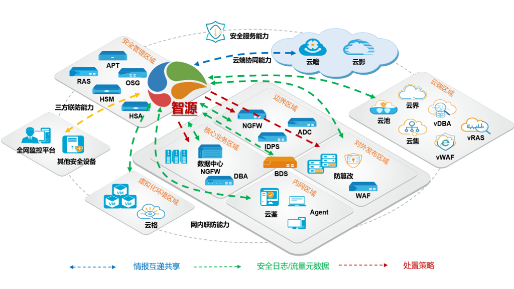 针对上述需求,山石网科通信技术股份有限公司(以下简称“山石网科”)规划落地了以智源安全运营平台为中心的XDR方案。通过智源安全运营中心联动NGFW、IDPS、HSM、WAF、云格、云界、EDR等多组件,构建起可持续安全运营体系。