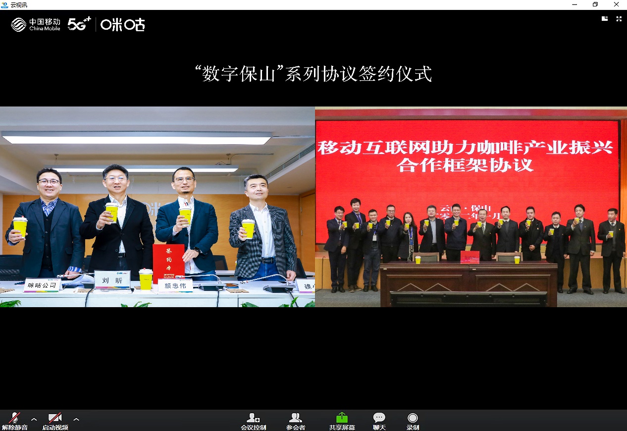 保山市政府副市长江楚、中国移动云南公司副总经理杜俊、中国移动咪咕公司副总经理颜忠伟共同签署了《移动互联网助力咖啡产业振兴合作框架协议》。