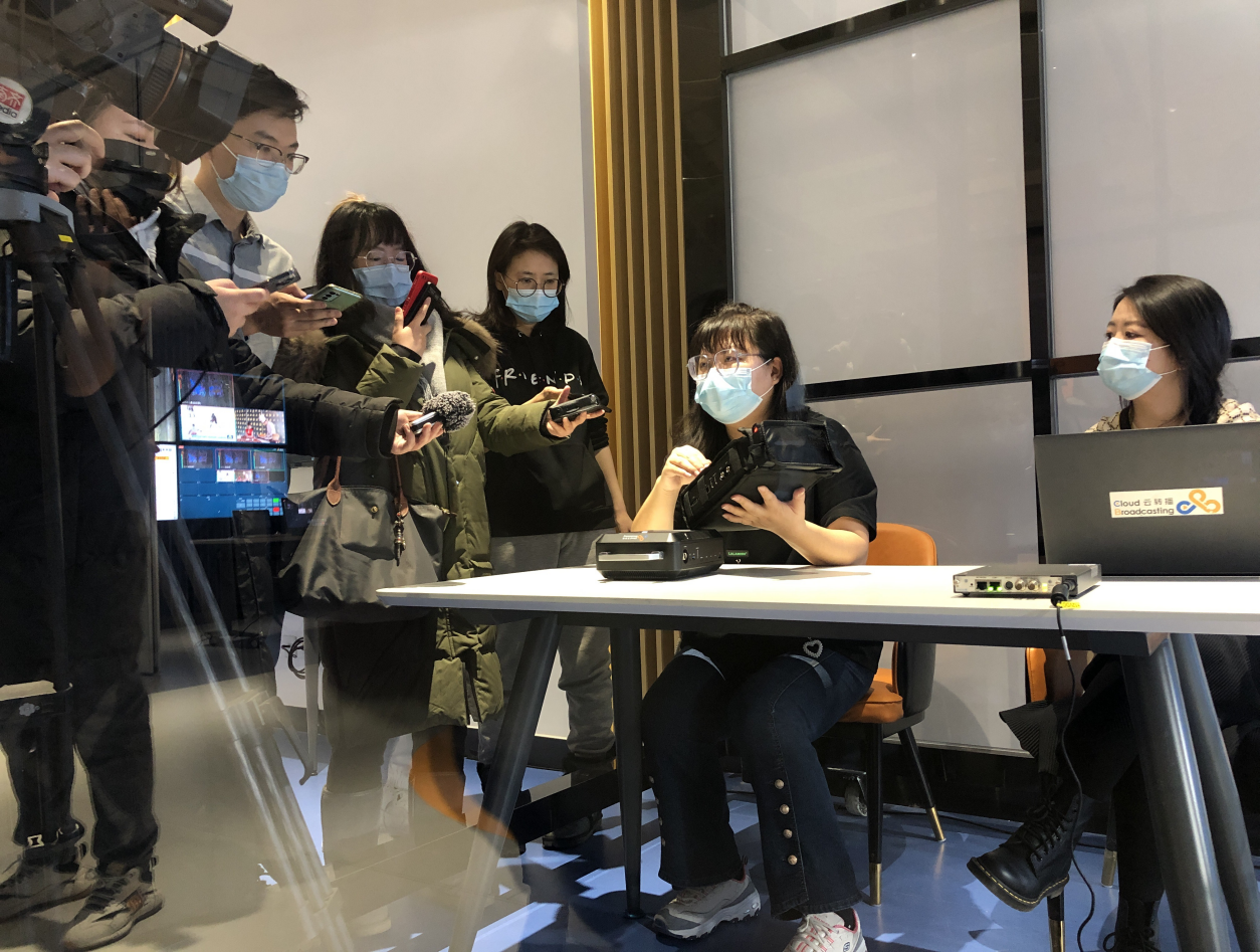 工作人员为记者现场展示5G云转播背包