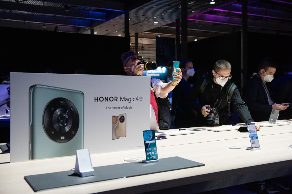2月28日,人们在西班牙巴塞罗那2022世界移动通信大会上体验荣耀新产品。(新华社发,古斯塔沃·巴连特摄)