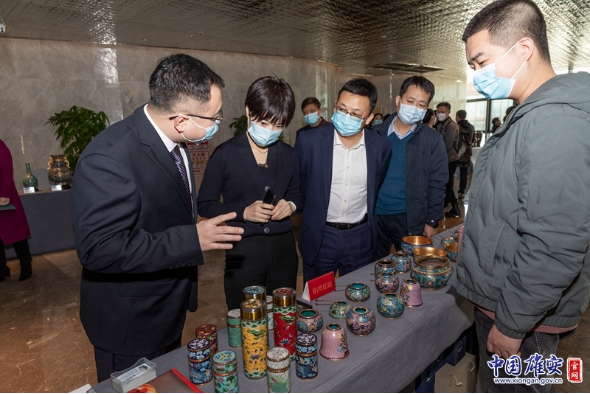 签约仪式结束后,与会人员共同参观了雄安新区雄县黑陶、京簧竹刻、掐丝珐琅、安新芦苇画等50余件非物质文化遗产展品及100余件(套)文创邮票、文创茶品等。