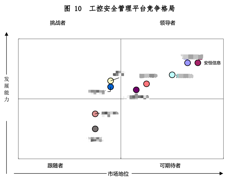 其中,安恒信息的工业安全管理平台和工控安全服务的竞争格局,工业安全态势感知系统和工控安全审计产品的竞争格局均居前列。同时工控漏扫、工控主机卫士、工控靶场及蜜罐三款产品的竞争格局也均进入领导者象限,发展势头强劲。