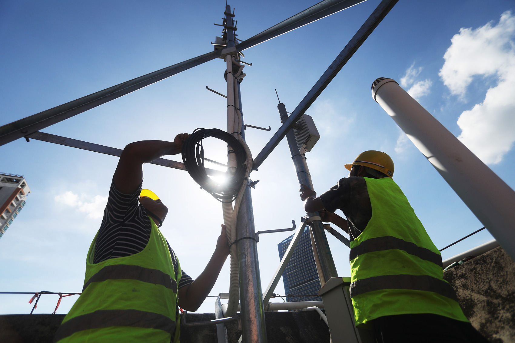工作人员在深圳龙岗进行5G基站施工铺设。