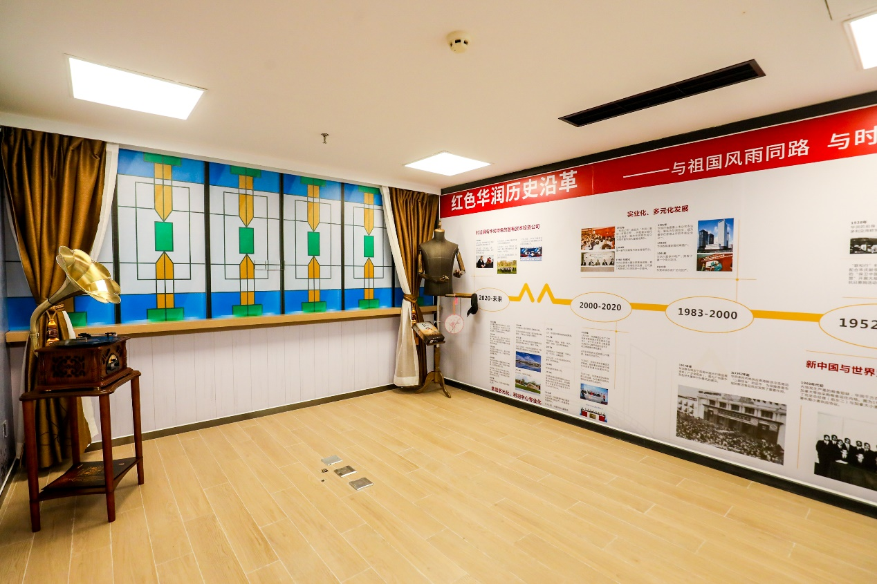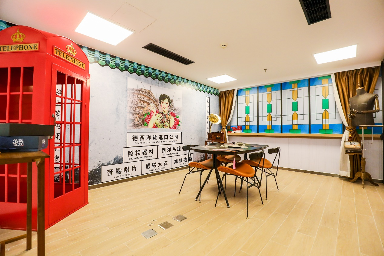 党建服务室从空间上被划分成两个区域——党员学习区和文化宣传区:在党员学习区,墙面上悬挂着鲜艳的党旗和醒目的入党誓词,红色的“不忘初心、牢记使命”标语,早已成为青年人的指引明灯,金色的“中国梦”更是每一个青年人的奋斗方向;文化宣传区的整体风格则被设计成为“民国风”,屋内的电话亭装置和播放音乐的唱片机,让人沉浸式体验红色华润在战争年代的飘摇岁月,感受发展初期的艰辛与不易,其中有整整一面墙讲述八十余年的华润发展史,这不仅是一段企业史,更是一段革命史、奋进史,而华润的历史只是时代的缩影,更希望用这样的方式提醒当代年轻人现在的时光来之不易。