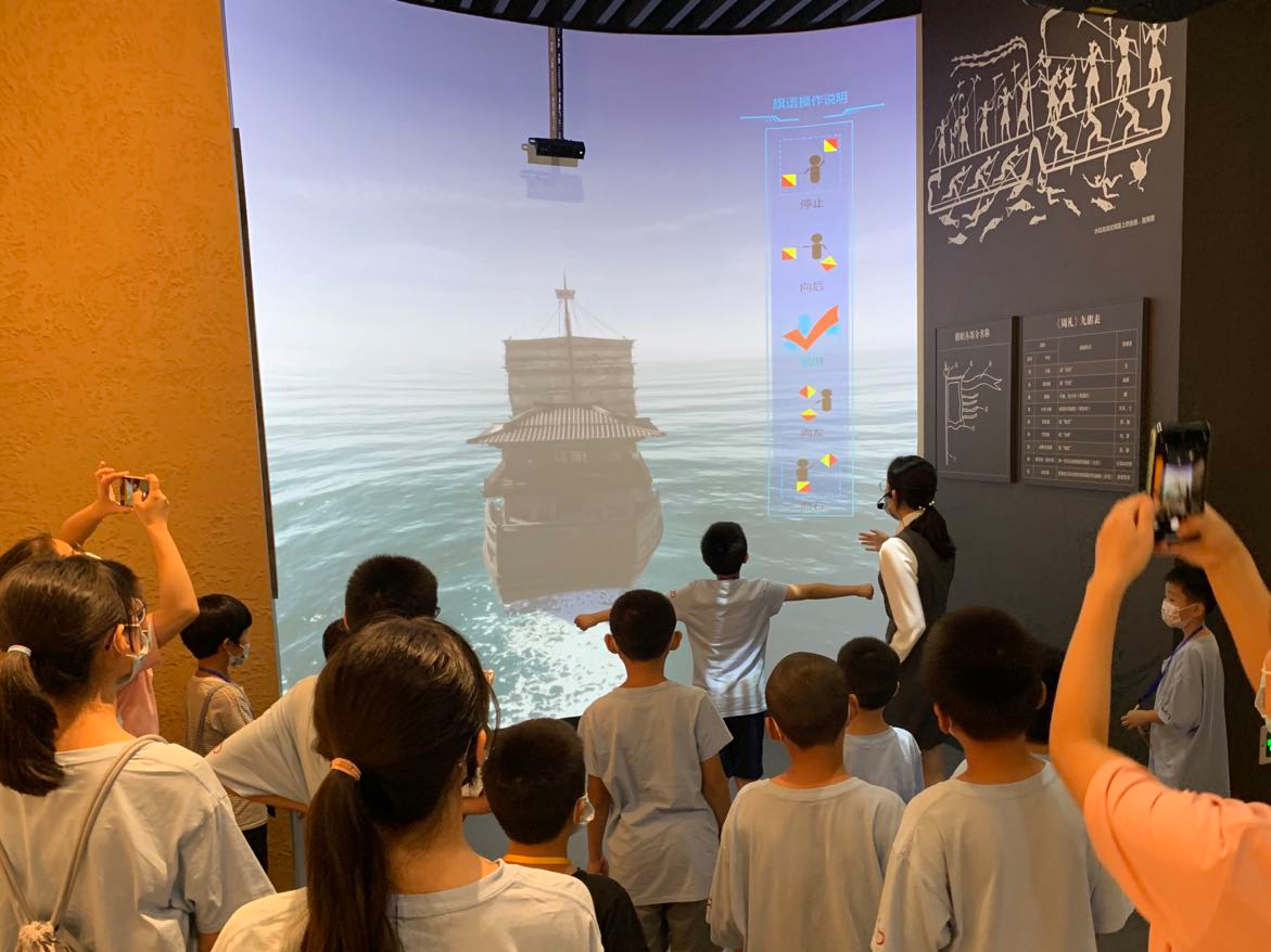 为提高观众的参观沉浸感,我馆依托中国电信超高速5G网络,精心设计了20余项数字化互动体验项目,在这里观众不仅能体验“旗语通信”“百年电报学堂”发报、“红色电波”抄报译报,还能体验到天翼云VR营造的沉浸视频、巨幕影院、VR直播等高科技娱乐体验项目。其中“百年电报学堂”发报体验项目,通过情景还原,再现了中国第一所电报学堂课堂内的场景(位于福州马尾的中国第一所船政学堂内),观众能模拟一名电报学员在这里进行考试,真实触摸电键,感受发报体验。