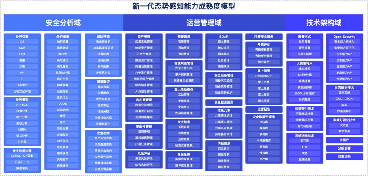 本次的战略升级特别提到了新一代态势感知建设成熟度模型。该模型是安恒信息结合6年态势感知实践,基于近3000家中大型企业的安全分析与运营实战提炼而成,从安全分析域、运营管理域以及技术架构域等3个层面、数十种安全能力维度,帮助政企进行新一代具备安全运营能力的态势感知建设和评估。