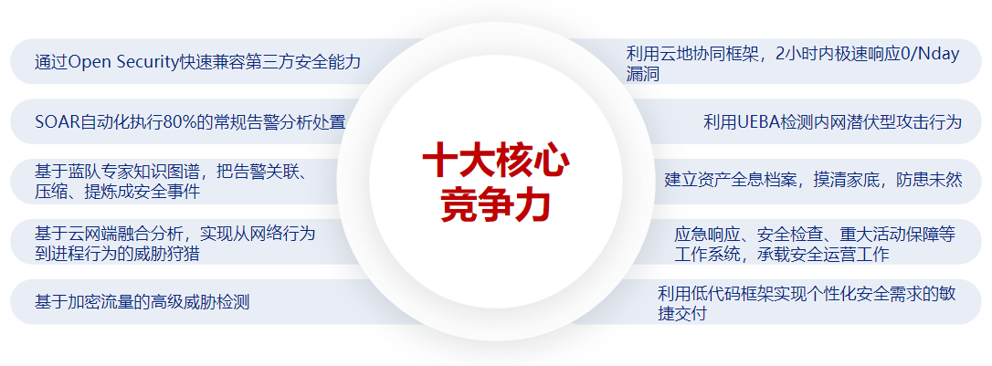 新一代态势感知平台升级了6大核心技术:“Open Security”能力中台实现各类异构网络安全设备兼容、标准开放;资产全息档案提供容纳云网数用端的一体化数字资产整合视图、使资产盘点工作增质增效;SOAR减少重复工作,提高运营效率;基于UEBA的账号安全检测实现用户与实体的异常检测,守卫内部安全;重大活动保障的系统化组织实践保证活动期间免受不法分子的攻击骚扰;低代码实现个性化需求敏捷交付。