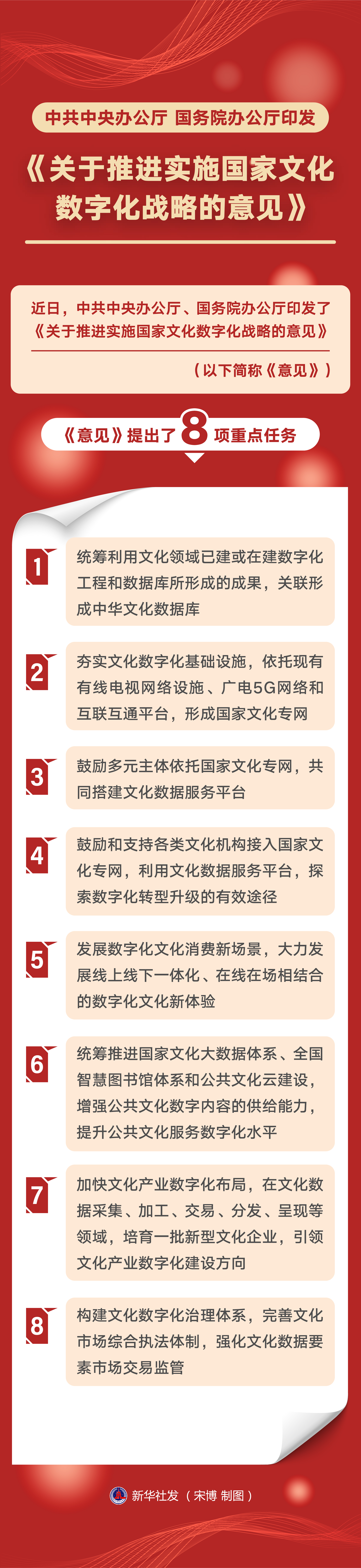 近日,中共中央办公厅、国务院办公厅印发《关于推进实施国家文化数字化战略的意见》。该意见聚焦战略目标和战略重点,对战略路径和步骤作出重点部署,是推动实施国家文化数字化战略、建设国家文化大数据体系的框架性、指导性文件。