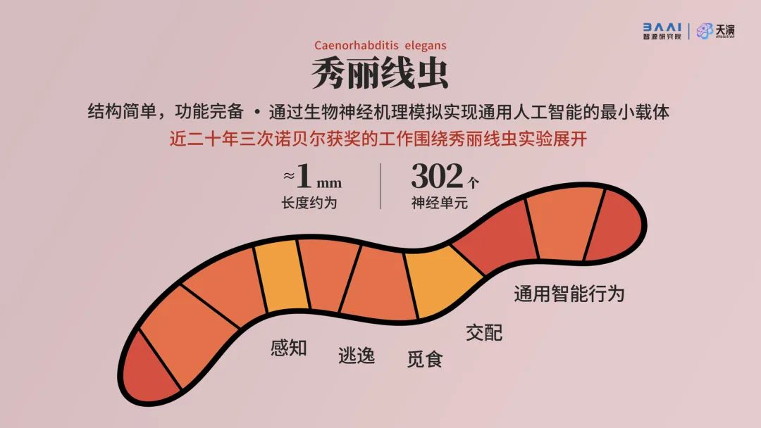 秀丽线虫是探索生命智能的典型模式动物。近20年,三次诺贝尔获奖工作都是围绕秀丽线虫实验展开。秀丽线虫约1mm长,有302个神经元,具备感知、觅食、逃逸、交配等各种复杂智能行为。