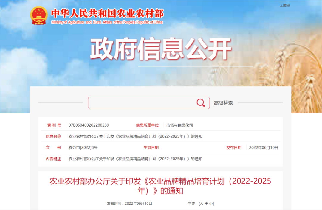 为深入贯彻中央农村工作会议、中央一号文件精神,加快农业品牌打造,夯实基础支撑,加强营销推广,提升服务能力,促进消费升级,全面提升农业品牌竞争力影响力带动力,我部决定实施农业品牌精品培育计划,为全面推进乡村振兴、加快农业农村现代化发展提供支撑。现将《农业品牌精品培育计划(2022—2025年)》印发你们,请结合实际,认真组织实施,并于每年12月底前报送工作总结和重点培育的农业品牌发展情况至农业农村部市场与信息化司。