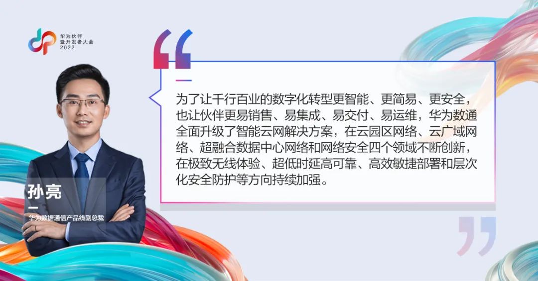 华为数据通信产品线副总裁孙亮表示,为了让千行百业的数字化转型更智能、更简易、更安全,也让伙伴更易销售、易集成、易交付、易运维,华为数通全面升级了智能云网解决方案,在云园区网络、云广域网网络、超融合数据中心网络和网络安全四个领域不断创新,在极致无线体验、超低时延高可靠、高效敏捷部署和层次化安全防护等方向持续加强。
