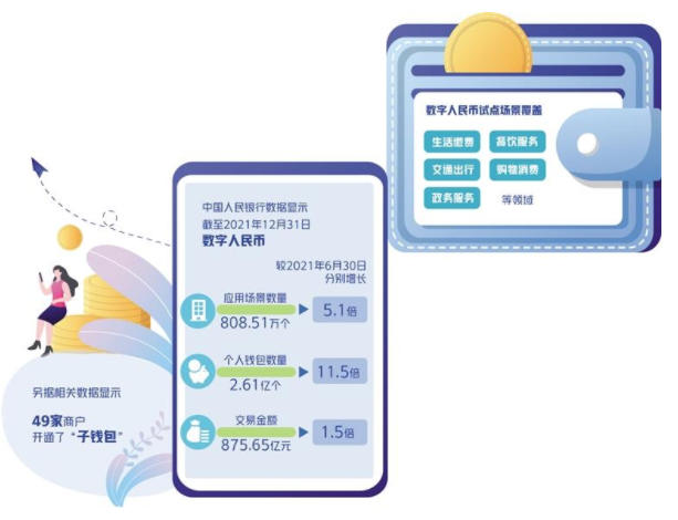 中国人民银行公布的数据显示,截至2021年底,数字人民币试点场景已超过808.51万个,累计开立个人钱包2.61亿个,交易金额875.65亿元。今年3月31日,数字人民币试点范围进一步扩大。在现有试点地区基础上,增加天津市、重庆市、广东省广州市、福建省福州市和厦门市、浙江省承办亚运会的6个城市作为试点地区,北京市和河北省张家口市在2022年北京冬奥会、冬残奥会场景试点结束后转为试点地区。