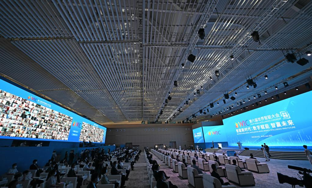 这是6月24日拍摄的第六届世界智能大会云开幕式暨创新发展高峰会现场。(新华社记者 赵子硕 摄)