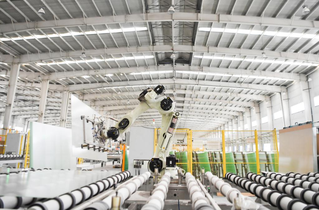 4月13日,工业机器人在彩虹(延安)新能源有限公司光伏玻璃生产线上作业。新华社记者 张博文 摄