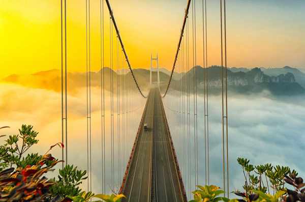 矮寨大桥飞越在德夯峡谷之巅,是跨峡谷的钢桁梁悬索桥,大桥跨径1176米,桥面距离峡谷底部355米。2007年10月开始修建,2012年3月建成通车,总造价15亿元。被赞为桥梁建筑艺术和自然景观完美结合的典范,矮寨大桥不只是连接湘渝的重要交通设施,更是湘西的标志性景点。