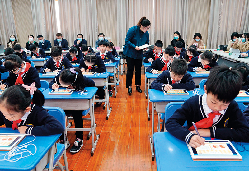 在上海市杨浦区平凉路第三小学的“教学助手”展示课上,四年级学生通过平板电脑进行课堂练习(2021年11月18日摄) 刘颖摄/本刊