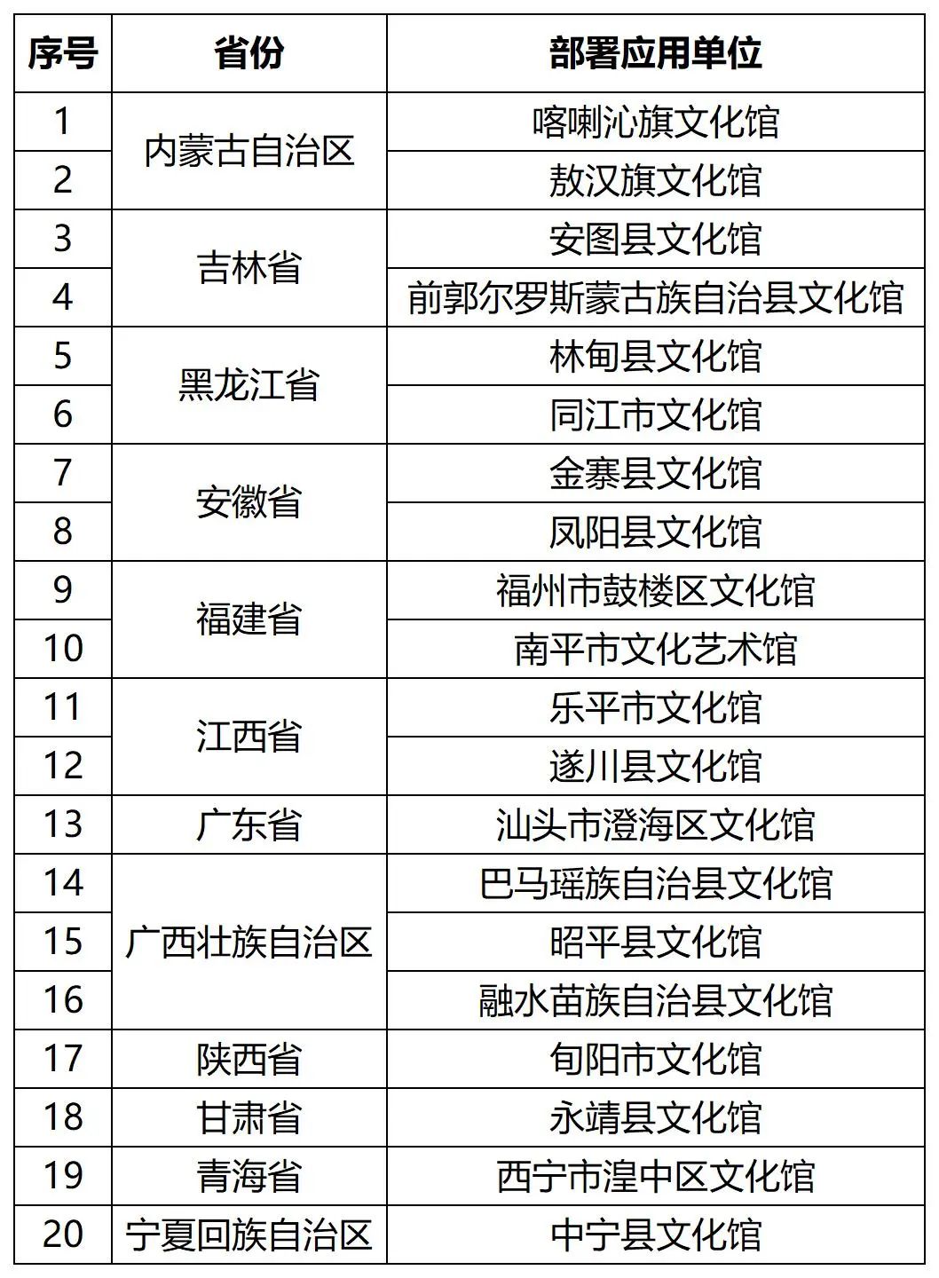 为进一步推进公共文化云基层智能服务端建设,宣传典型,推广经验,提升效能,文化和旅游部全国公共文化发展中心(以下简称“发展中心”)组织开展了公共文化云基层智能服务端2022年首批典型应用案例征集工作。经各省积极组织申报、专家评审、公示,内蒙古自治区喀喇沁旗文化馆、敖汉旗文化馆等20家单位入选公共文化云基层智能服务端2022年首批典型应用案例,名单如下: