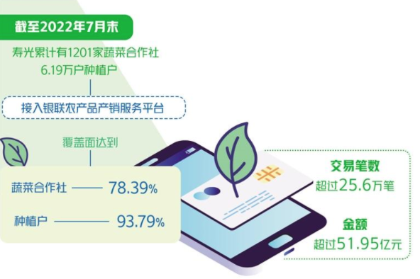 至此,一个集产销撮合、线上记账、支付结算、农村信用和融资惠农于一体的产销服务平台在“田头市场”开花结果。中国银联山东分公司总经理刁云涛表示,以“云闪付”APP为载体,银联合作社产销服务平台创新开展了金融支农产品、业务、品牌和服务,全面推动移动支付向乡村“下沉”,解决了辖区果蔬合作社交易结算不通畅、收购业务繁琐、资金流转不安全等诸多问题。尤其是2020年以来,中国银联与寿光农商行以党建为引领,银联山东分公司、银联旗下金卡生活与寿光农商行开展党建共建,增进了双方在业务和党建工作方面的全方位合作,共同促进了银联农产品产销服务平台在当地的全面推广。数据显示,截至2022年7月末,累计有1201家蔬菜合作社、6.19万户种植户接入该平台,覆盖面分别达到78.39%和93.79%。交易笔数超过25.6万笔、金额超过51.95亿元。