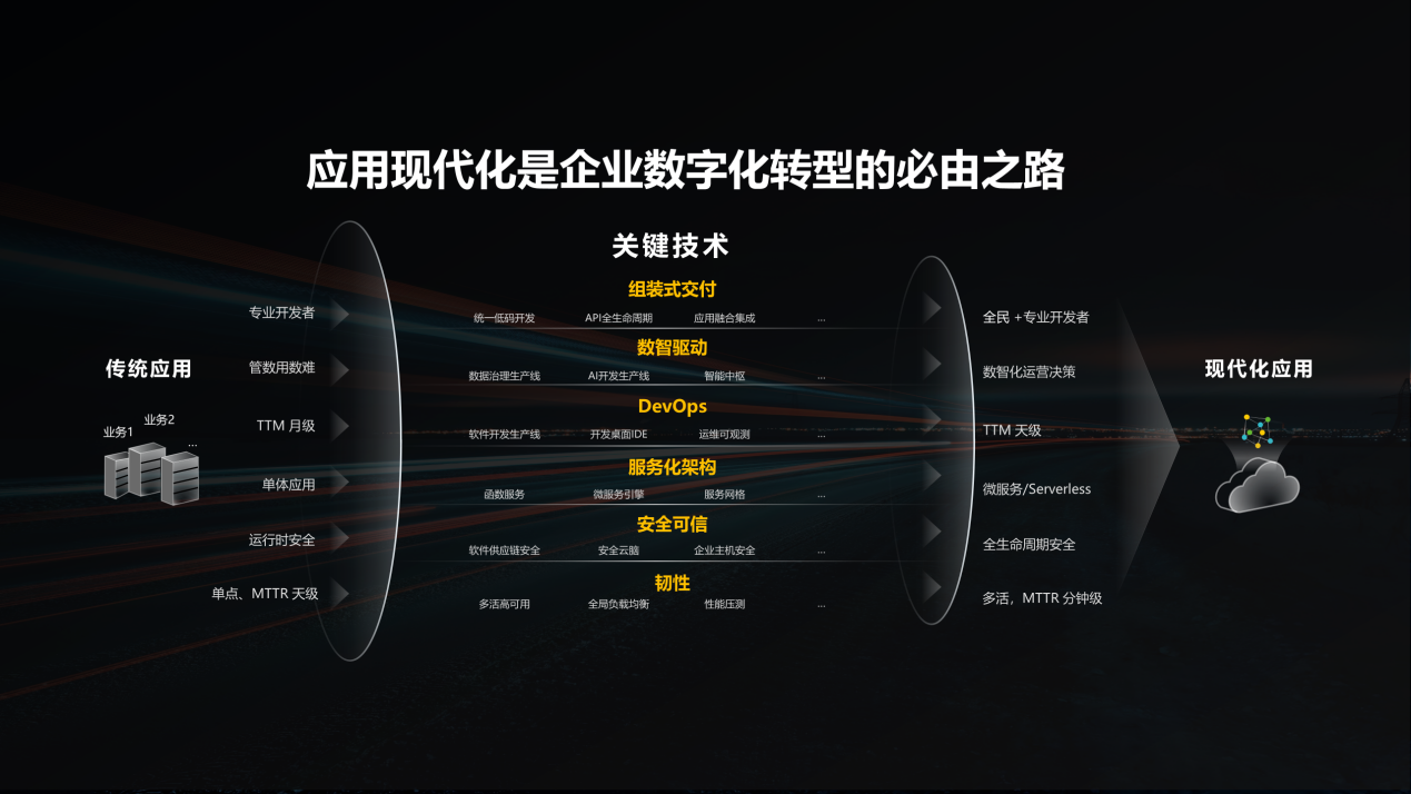张平安表示,传统企业要快速实现应用的现代化,组装式交付、数智驱动、DevOps、服务化架构、安全可信和韧性六大关键技术至关重要:首先,通过低代码、零代码的组装式交付,让应用的使用者也可以参与到应用开发中,实现全民开发,加速业务创新与孵化;其次,开发模式要从传统的“瀑布式”开发到云上数智驱动的DevOps和DataDriven,实现应用上线周期从月级到天级的跨越,让应用开发走向自动化和智能化;最后,要解决传统单体应用的故障高发、单点安全等问题,需要向微服务/Serverless等服务化架构演进,并采用异地多活高可用的部署来保障企业业务的韧性,从以前单纯的运行时安全扩展到开发、运行、软件供应链的全生命周期安全。