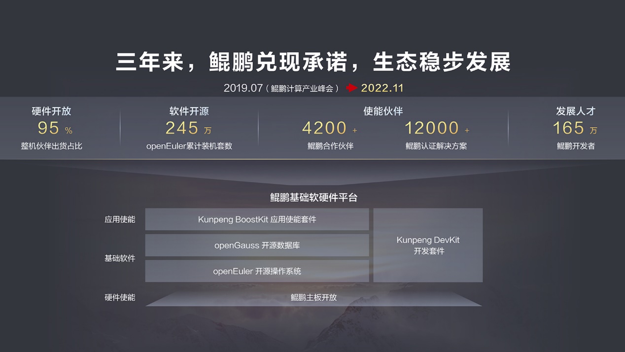鲲鹏产业生态稳步发展,硬件伙伴出货占比已达95%以上。欧拉实现从企业主导到产业共建,快速跨越生态拐点,当前累计装机量达245万套,预计今年底在中国服务器操作系统领域新增市场份额将达25%,有望成为中国新增市场份额第一。鲲鹏开发套件DevKit和应用使能套件BoostKit持续优化,提升原生开发能力,助力开发者极简开发,今年底在国计民生行业的生态满足度将超过70%,当前已发展4200多家伙伴,已发布12000多个鲲鹏认证解决方案,在政府、金融、交通、电力等行业规模应用。
