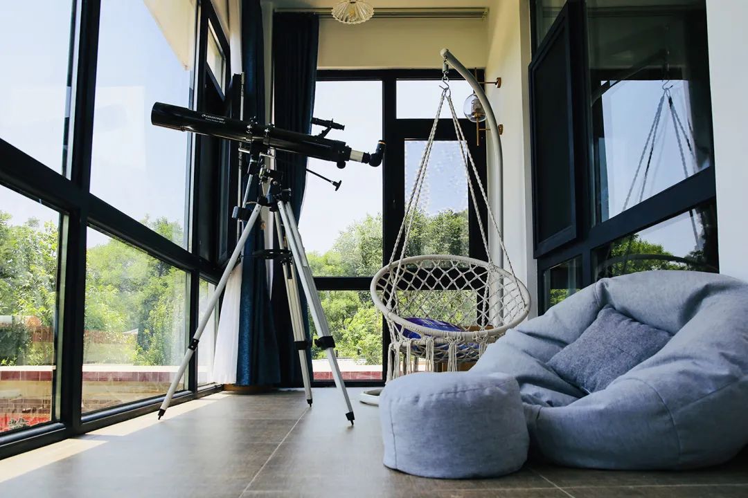 博士小院内住宿有两栋楼,蓝顶白墙,落地大窗,都是家庭房设计,不同主题房间内都有两张大床,一个家庭三到四人,配有独立洗漱间。