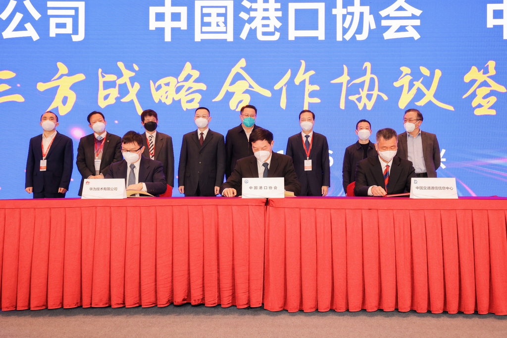 2022年12月16日,在2022智慧港口大会期间,华为技术有限公司(以下简称“华为”)与中国港口协会、中国交通通信信息中心举行战略合作签约仪式。华为公司副总裁、公路水运口岸智慧化军团CEO马悦等相关领导出席并见证签约仪式,中国港口协会常务副会长陈英明、中国交通通信信息中心副主任林榕、华为公路水运口岸智慧化军团CTO岳坤分别代表三方签约。