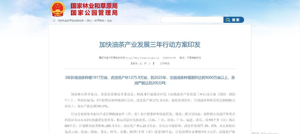 国家林草局、国家发展改革委、财政部日前联合印发《加快油茶产业发展三年行动方案(2023—2025年)》,明确了2023年至2025年完成新增油茶种植1917万亩、改造低产林1275.9万亩,到2025年全国油茶种植面积达到9000万亩以上、茶油产能达到200万吨等一系列发展目标。