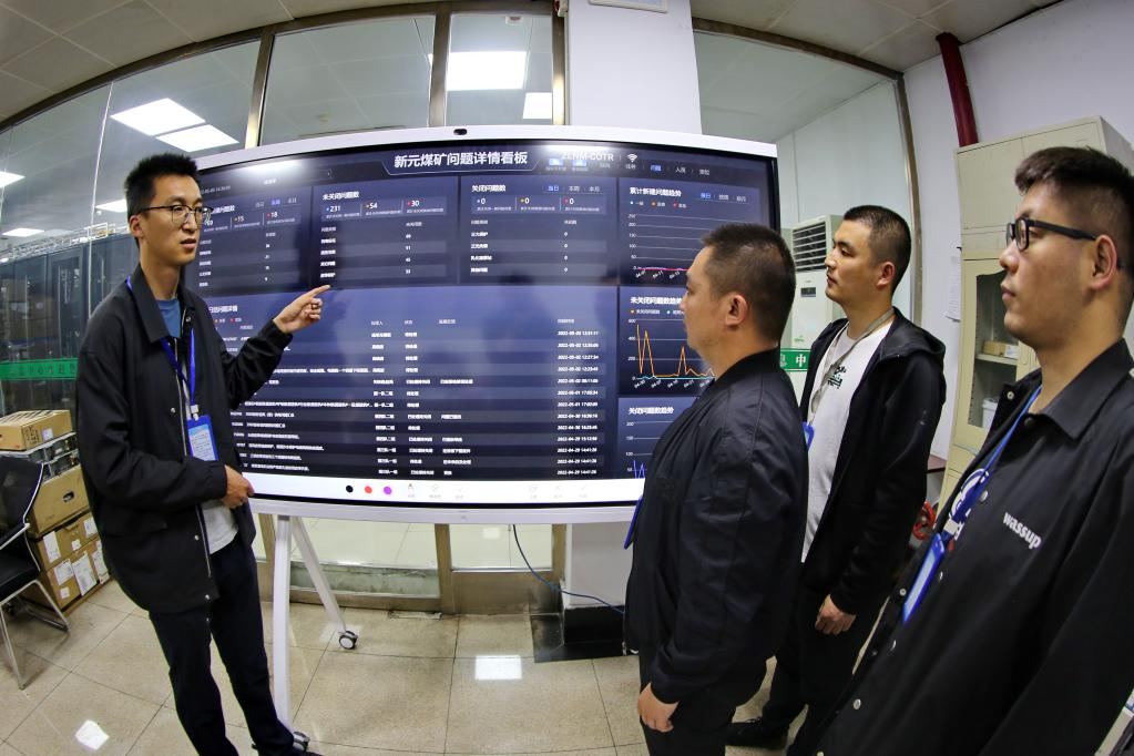 在山西省阳泉市新元煤矿,5G+智能办技术人员在“智能作业管理平台”大屏前讨论平台运行情况(2022年5月20日摄)。新华社发