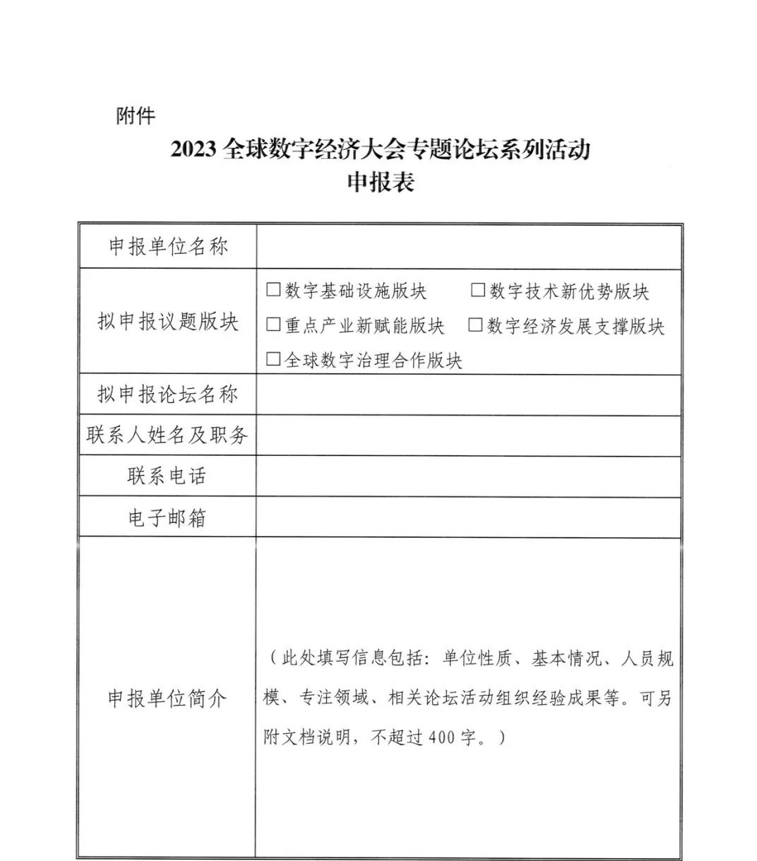 2023全球数字经济大会拟于7月举办,近期大会组委会面向各有关单位公开征集大会专题论坛系列活动。相关要求如下: