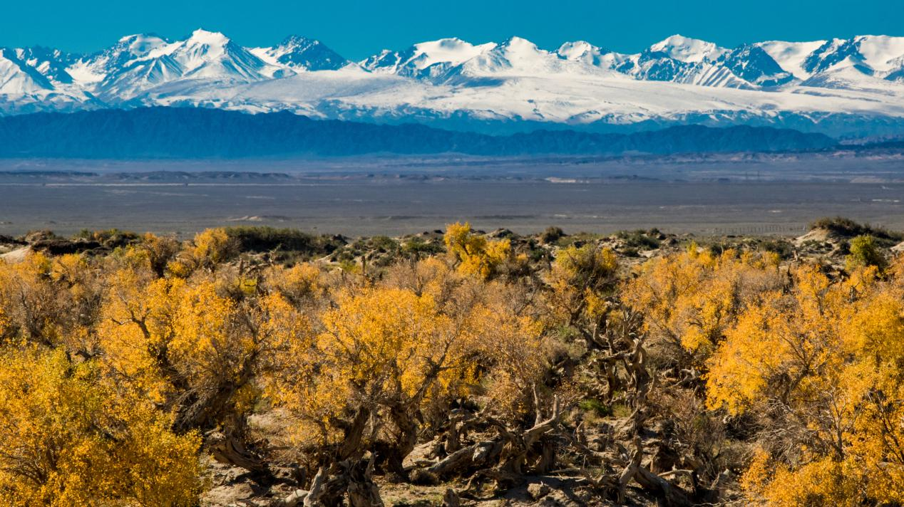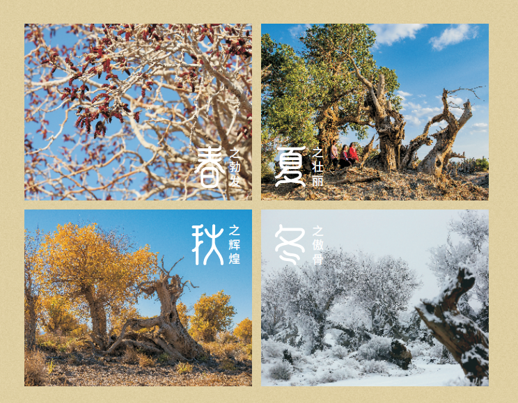 胡杨亦称“胡桐”,维吾尔语称“托克拉克”,意为“最美丽的树”。胡杨的出现可以追溯至一亿三千五百万年前,是世界最古老的杨柳科树种,生物学家称它为“第三纪活化石”。胡杨耐寒、耐热、耐碱、耐涝、耐旱,千百年不屈不挠,用身躯阻挡了沙暴的侵袭,形成一道雄伟壮阔的绿色长廊,在丝绸之路上尽显风姿。