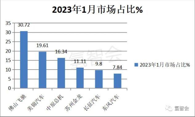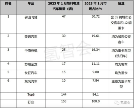 在氢能产业链中游领域,根据1月份氢燃料汽车销售数据来看(数据由氢智会提供),飞驰科技凭借1月销售47辆FCV(35辆氢燃料电池城市公交客车和12辆燃料电池牵引车),牢牢占据国内市场份额榜一位置。