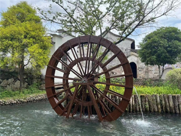 夜色静美,月光旖旎,远山近村,更添几分冷艳的妩媚。我们沿着村道一路向里,天上的星月忽闪忽闪的,仿佛也跟着我们走。不一会儿听见了泉水淙淙,“吱呀吱呀”的水车在水流的冲击下旋转翻滚着,溅射的水花吸引着黑压压的鱼群。我突然想到一句话“流水不争先,争得是滔滔不绝。”这就是感德堰,修于南宋,时年堰渠开通之时,一段暗涵沙石淤积,一村民钻进涵洞进行疏通,不料溪水暴涨,不幸遇难。村民们为纪念他,将堰取名感德堰。感德堰像一匹柔软的碧玉带,镶嵌在母亲的怀里,它坦荡无私,用自己的乳汁哺育两岸百姓。这条长达6公里的水渠,担当着2万多人的生活用水和1000余亩良田的灌溉。水堰的上游是韦羌溪,溪的源头是神仙居,鱼翔浅底,一泓清水穿村而过,这是这个村庄独有的灵气。