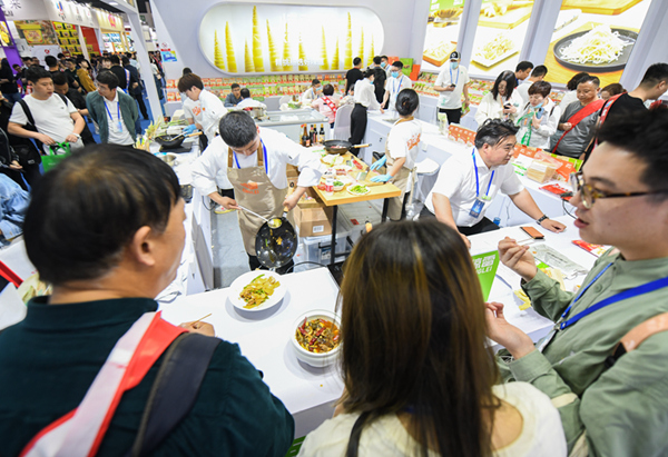 4月12日,在四川省成都市中国西部国际博览城,第108届全国糖酒商品交易会开幕。客商在品尝预制菜产品。新华社记者 王曦 摄