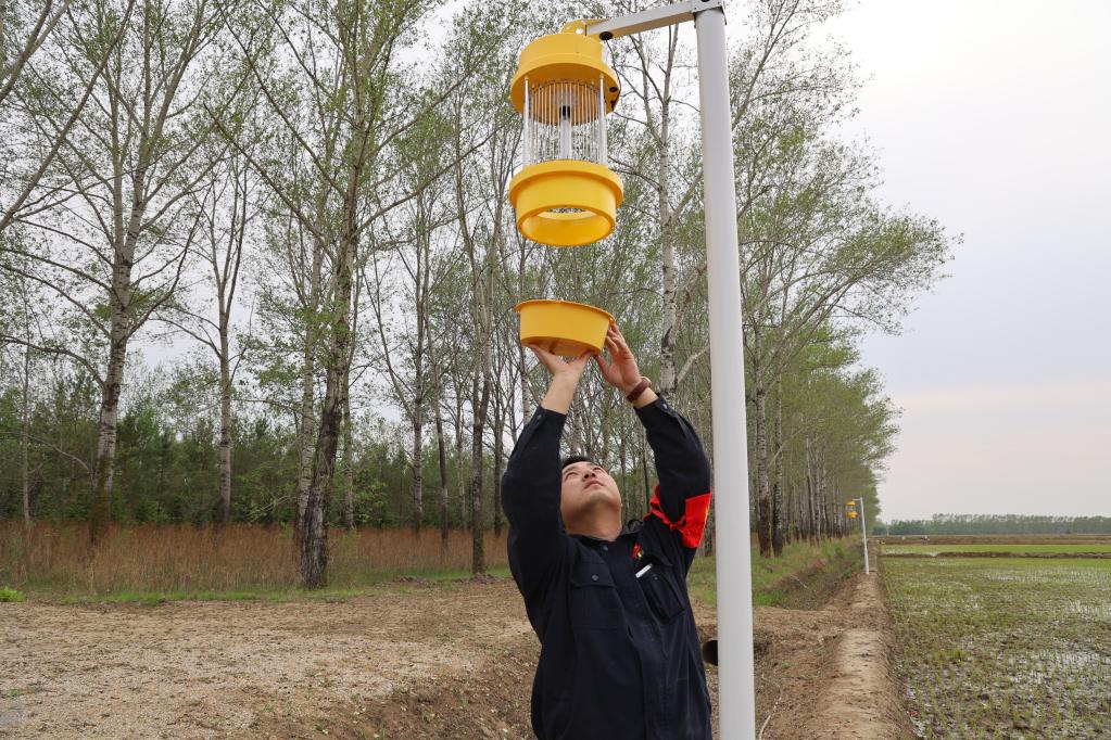 北大荒集团军川农场有限公司工作人员正对频振式杀虫灯进行检修。(受访者供图)