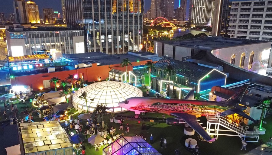 市民在天津市和平区金街商圈的“印象城”楼顶休闲游玩。新华社记者 赵子硕 摄