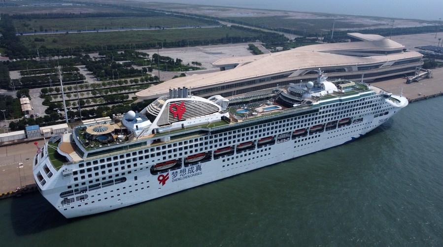 7月11日,天津东方国际邮轮有限公司旗下“梦想”号邮轮靠泊在天津国际邮轮母港。新华社记者 赵子硕 摄