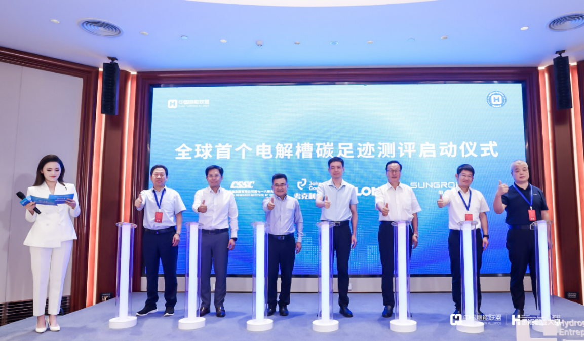 仪式环节,刘玮、马林聪、联合国开发计划署助理驻华代表、民生与经济发展部主任张卫东、中船(邯郸)派瑞氢能科技有限公司总工程师薛贺来、考克利尔能源亚太区总裁兼考克利尔竞立(苏州)氢能科技有限公司总经理林立邦、西安隆基氢能科技有限公司副总裁王英歌、阳光氢能交付中心总经理罗宣国共同启动第一批电解槽碳足迹评价工作。德凯质量认证(上海)有限公司中国认证与业务保障总经理韦斌生为中国氢能联盟研究院氢溯平台颁发认证证书。
