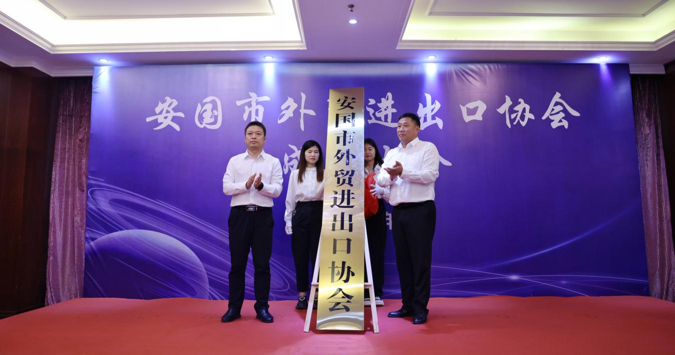 8月19日,河北省安国市召开外贸进出口协会成立大会,安国市市政府负责人姚向中与新当选的安国市外贸进出口协会会长刘锁方共同为协会揭牌。