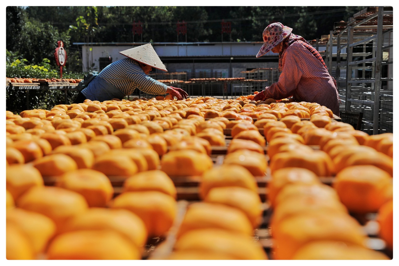 大田柿花加工程序考究。采摘柿果,一般在秋收后叶落果熟时节,即立冬前后,选择大好晴天,边抢收边加工,将柿果去皮,置放在竹笪上抢晒三五天,柿果要逐个揉搓成浑酱状。接着翻晒加工约20至25天,直至水分基本蒸发干净,表层自然释出白粉状的柿霜,便成了色泽金黄、肉质精亮,有蜂蜜味的柿花。这种传统而独特的工艺,保留了大田柿花独特的口感,并被当地百姓一直延续下去。