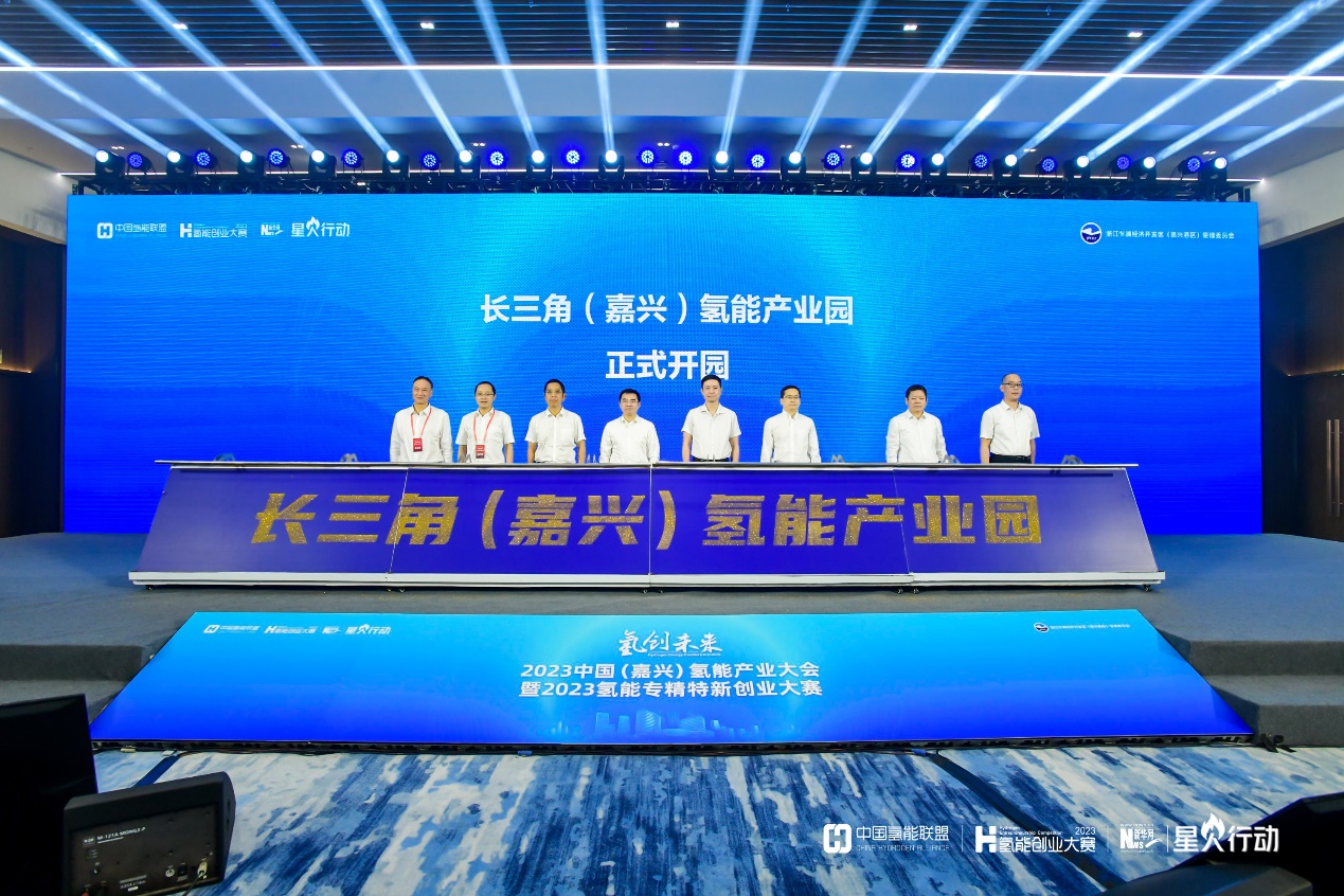 倪沪平,中国氢能联盟秘书长、国家能源集团国华投资公司(氢能公司)党委副书记、总经理刘玮,中国特种设备检测研究院副院长李军,浙江清华长三角研究院副院长冯叶成,浙江省应急管理厅副厅长李公杭,浙江省金融控股有限公司党委副书记、董事翁文斌,浙江乍浦经济开发区(嘉兴港区)党工委书记冯中海,嘉兴市经济和信息化局局长章澜共同为长三角(嘉兴)氢能产业园揭牌。