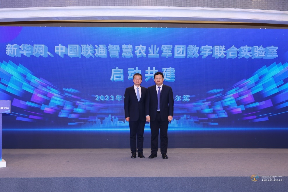 图为新华网首席信息官姚予疆(左),联通(黑龙江)产业互联网有限公司党委书记、总经理、中国联通智慧农业军团常务副军团长王全新(右)上台启动共建“新华网、中国联通智慧农业军团数字联合实验室”。